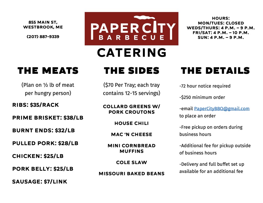 Please email PaperCityBBQ@gmail.com for catering orders. Pricing and details below!